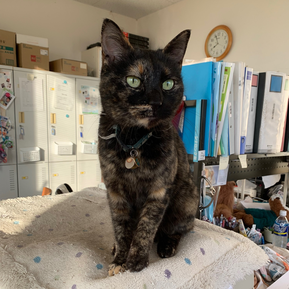 甘えん坊のおてんば娘で、スタッフを木と間違えて?肩に飛び乗って来たり、何も考えずに外に飛び出して、一晩寒い中で震える羽目になったりと困った子ちゃんです。でも憎めないキャラなんですよねー。
