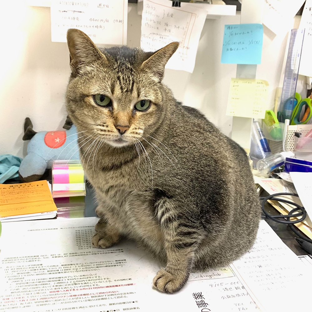 クラブオープン時に何処からともなくやって来て住み着いた、一番古株の猫ちゃんです。甘えん坊で鼠取りはお手のもの。事務所仕事もこの通りこなしています!(ウソ)でも、猫の中では何故か一番弱い立場なんですよねー。